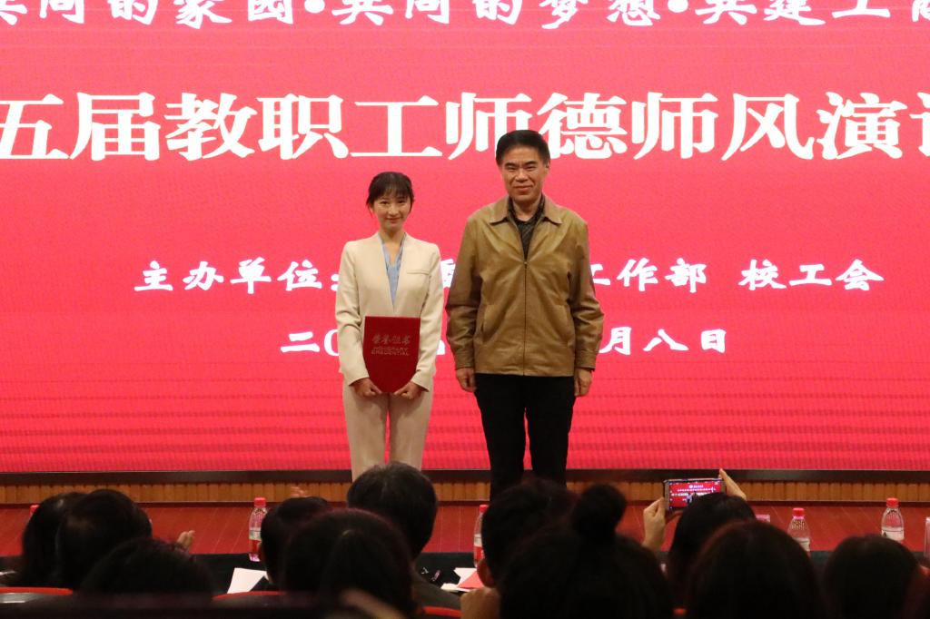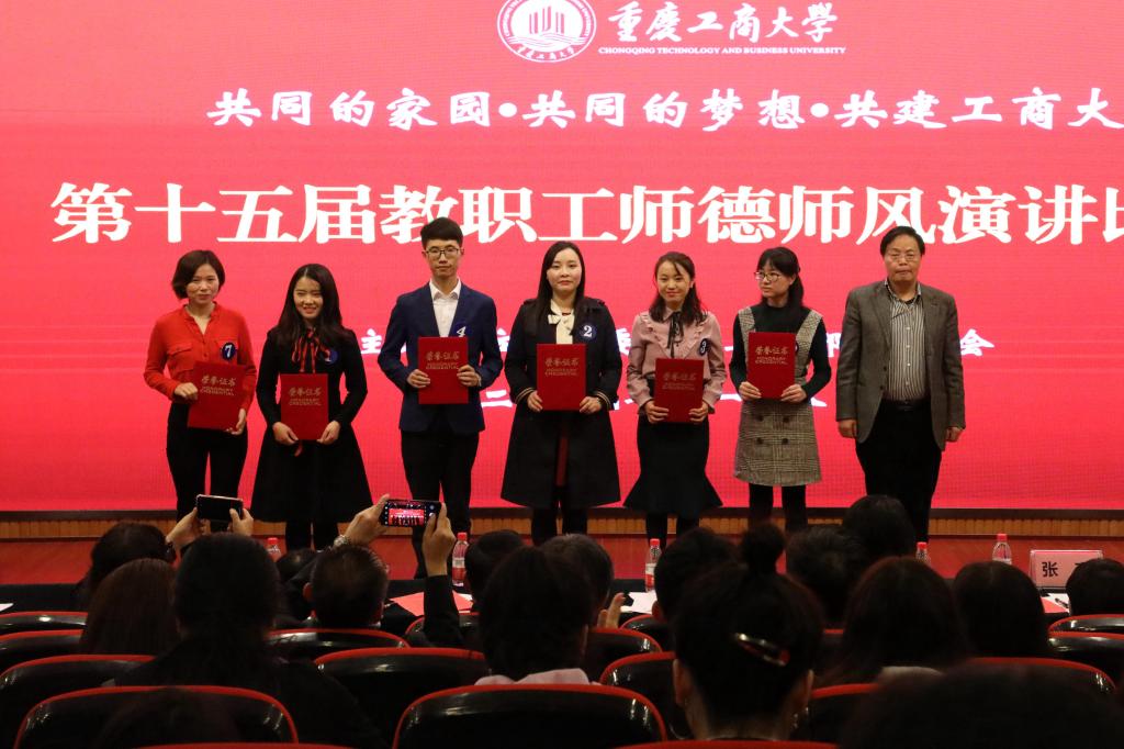 十名选手演讲结束后,由党委教师工作部副部长李莉莎、外语学院党总支书记陈晓东、通识学院党总支书记兼院长包晓玲、环境与资源学院韦晓兰、商务策划学院张彦五位教师组成的专家评审团以及来自各部门工会推荐组成的大众评委团经过公平公正的评判,现代国际设计艺术学院教师刘柳含演讲的《我愿做那只燃烧着的蜡烛》荣获一等奖,管理学院教师杨笑杨演讲的《教育与使命》、外语学院教师姜蓉蓉演讲的《不忘初心,做一个有温度的老师》、机关十五工会教师刘鸿燕演讲的《甘做人梯,不忘初心,不负韶华》获得了二等奖;国际商学院教师贾代春演讲的《以德立教,以身为表》、会计学院教师蒋秋菊演讲的《甘于平凡,乐于奉献》、通识学院教师黄梅演讲的《平凡的岗位,不平凡的爱》、数学与统计学院教师姜淼演讲的《但行好事,莫问前程》、旅游与国土资源教师胡迎春演讲的《初心引领,责任在肩》、财政金融学院老师蒋伟燕演讲的《爱与责任》获得了三等奖。党委书记李志雄、校长孙芳城、副校长何勇平为获奖者颁了奖。