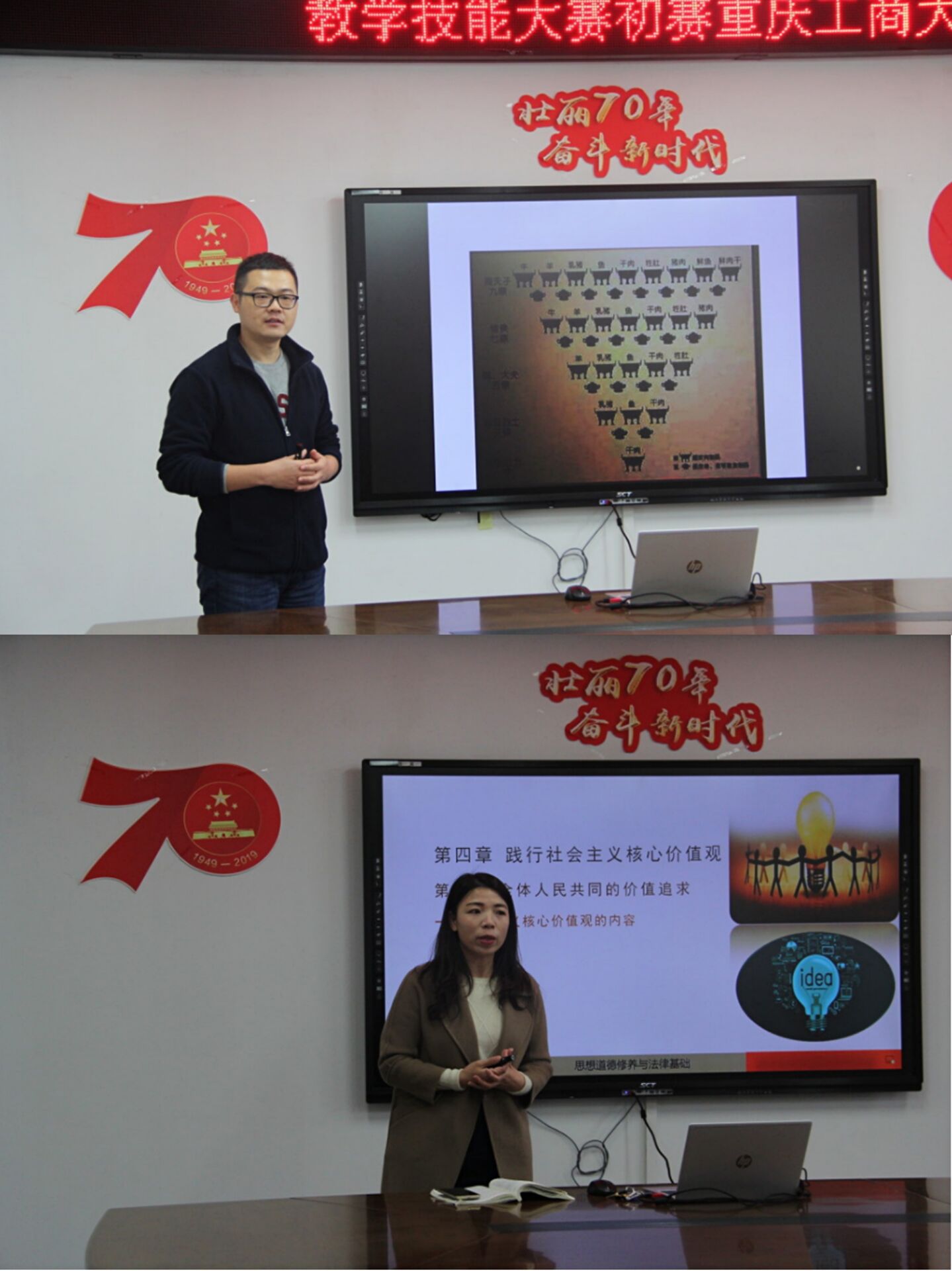 为了贯彻落实习近平总书记在全国高校思想政治工作会和学校思想政治理论课教师座谈会上的重要讲话精神,严格按照高校思想政治理论课教师队伍建设要求,落实教育部和重庆市教委的相关文件精神,落实“重庆市高校思想政治理论课教师教学技能大赛”工作要求,2019年11月22日上午,重庆市高校思想政治理论课教师教学技能大赛初赛在马克思主义学院慧智楼91210如期举行。周希贤教授、朱伯兰教授、余常德教授担任本次比赛评委。