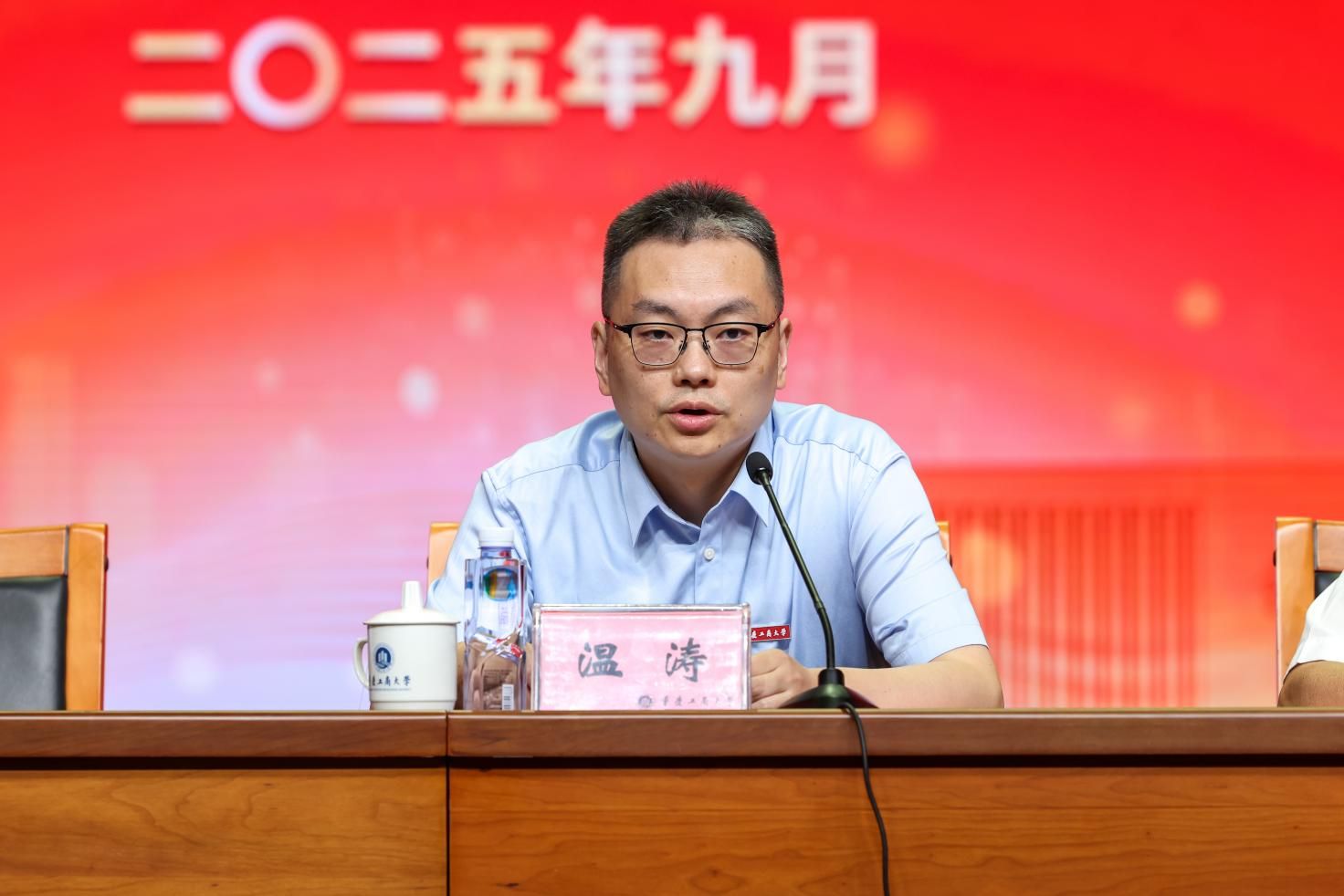 温涛在主持中表示,过去一年里学校全面贯彻落实党的二十大和二十届二中、三中全会精神,深入学习贯彻习近平总书记关于教育的重要论述和全国教育大会精神,全体教职员工坚守立德树人初心,牢记“为党育人、为国育才”使命,同心同德,奋力拼搏,谱写了学校教育事业发展的新篇章。希望教师们在教学中深耕,在科研中突破,在服务中创新,共同书写学校发展的新篇章;要继续以赤诚之心、奉献之心、仁爱之心投身教育事业,认真落实全国教育大会精神,以教育家精神铸魂强师,谱写教育强国建设华章。