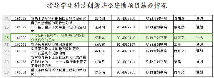 2017年带领学生参加由教育部学校规划建设发展中心组织的大学“百校百题”应用型创新课题(财税领域)大赛,获得B区复赛第一名;2015年指导潘婷婷等同学获得第十四届“挑战杯”全国大学生课外学术科技作品竞赛重庆赛区一等奖;2016年指导三项学生科技创新基金资助项目,均顺利通过结题验收,其中梁羽龙等同学科技创新基金资助项目《“互联网+税务”:加快推动纳税服务现代化的思考》获得优秀结题。
