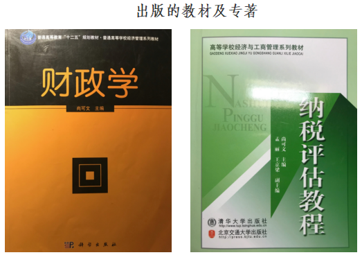 尚可文老师已经出版《财税改革前沿问题研究》、《政府、市场与财政》、《税收征管模式改革与创新》专著3部。先后主持完成国家税务总局税收科学研究所重点研究课题《落实长江经济带战略之税收政策研究》课题1项;重庆市财政局《公共租赁住房税收政策研究》课题1项;重庆市地方税务局《促进小微企业发展的税收政策研究》课题1项;完成重庆市南岸区地方税务局、渝中区地方税务局、巴南区地方税务局委托课题多项。并结合十八届三中全会精神和十九大报告的内容,将课题研究成果及时应用到课堂教学过程中,收到了良好的教学效果。